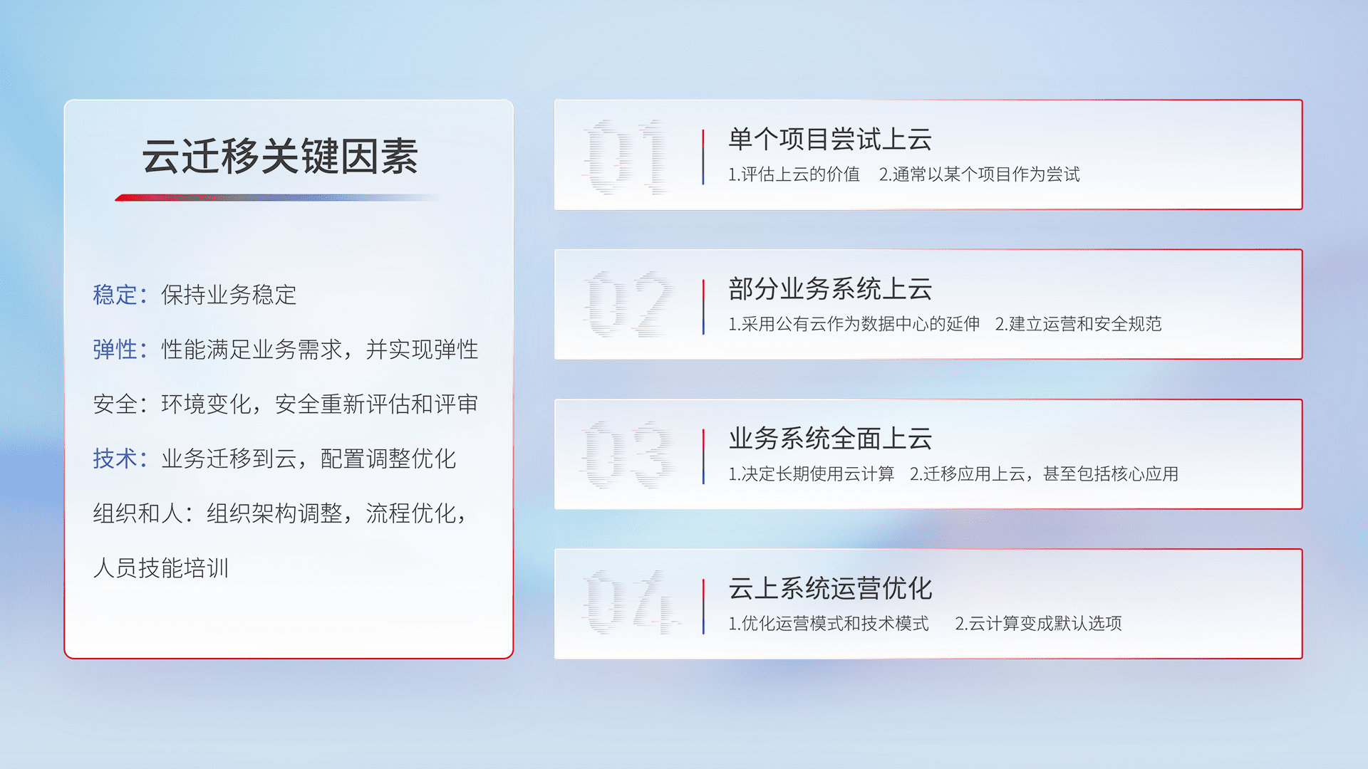 结合实际业务,,从规划设计、、云平台选型、、、、云原生改造、、、数据迁移、、集成交付,,迁移全过程为客户识别最佳上云路径,,,,做好风险识别管理,,,设计网络架构、、、、身份权限、、安全审计合规、、操作审计、、、、日志审计、、、、监控告警策略、、多站点容灾设计等,,,,对云上基础设施进行整体规划,,,,提升IT治理水平,,,,以满足弹性、、、高可用、、高性能的需求。。